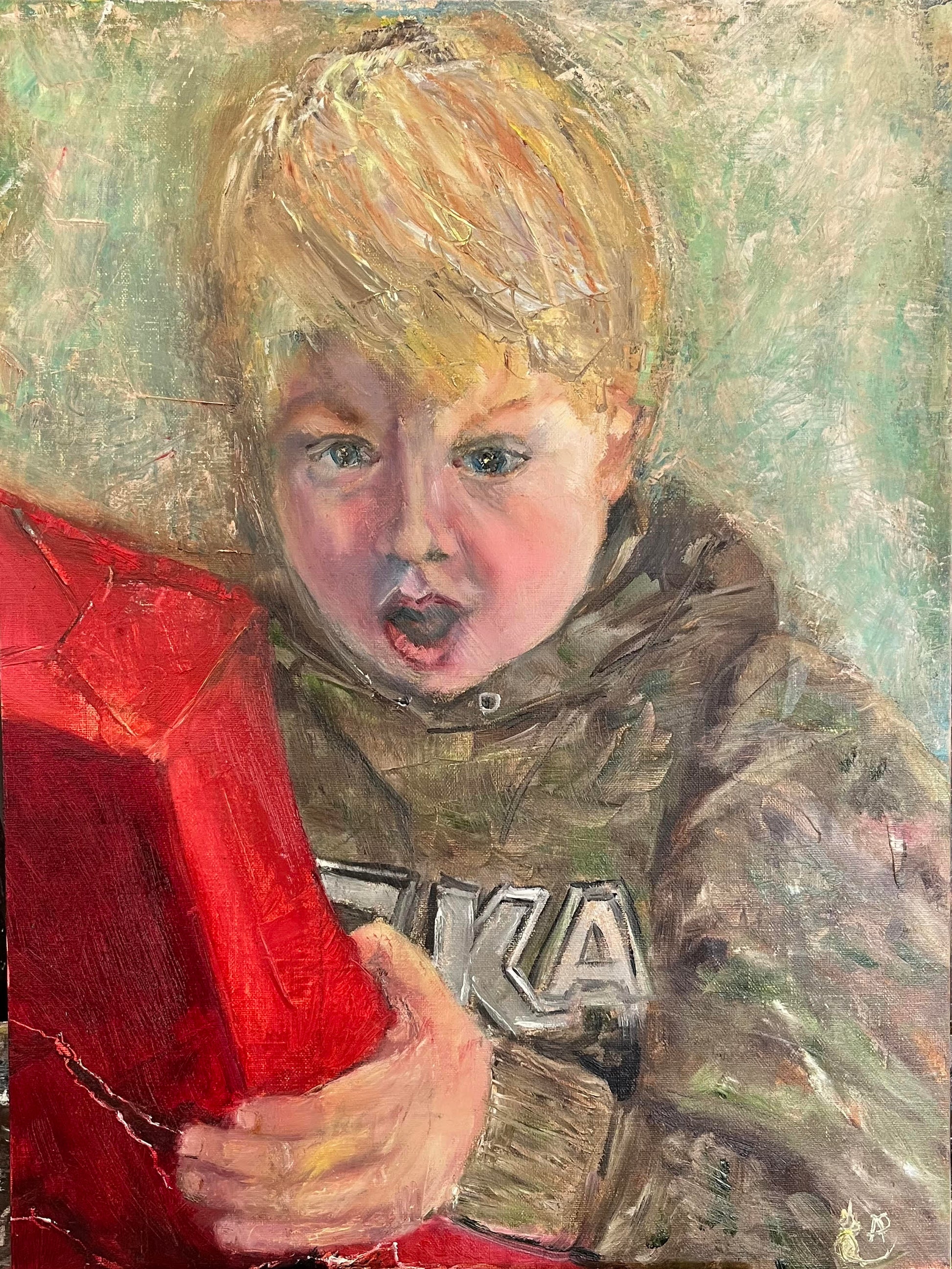 Painting a young one with a lot of energy can be a challenge, but I took the opportunity to try and paint more loosely. My grandson, captured in oil.